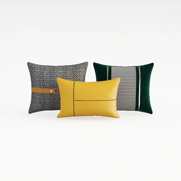 A 3D model of a Pillow/Cushion set, featuring knit, leather, velvet materials with geometric patterns, stripes, and color-block designs. It has a modern, stylish aesthetic and suits home decor or interior design.