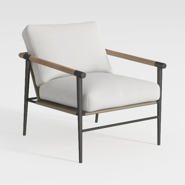 The armrests, crafted from light oak with visible wood grain, add a tactile, earthy contrast to the frame, their smooth finish inviting gentle contact. The black metal legs, with a matte, brushed texture, ground the piece sturdily, balancing the organic warmth of the wood with a sleek, industrial edge. Together, these elements create a visual harmony—light and dark, soft and structured—rendering the chair both calming and visually engaging.