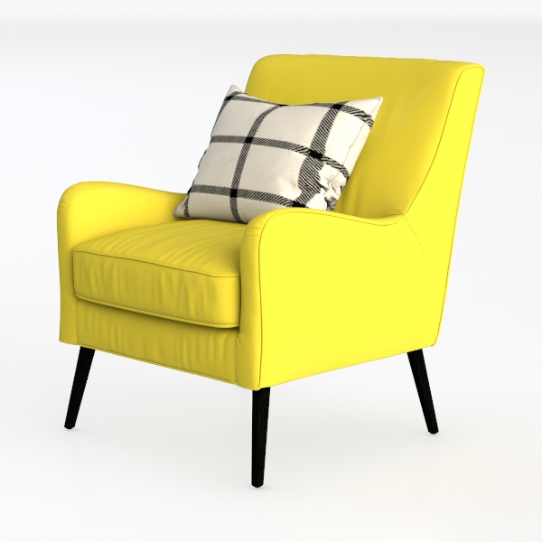 Complementing its bold color, the chair features a stylish plaid cushion that adds a layer of warmth and texture, creating an inviting atmosphere. This seating piece is perfect for a contemporary lounge or a cozy reading nook, ideally paired with a sleek glass coffee table and accentuated with warm wooden elements.