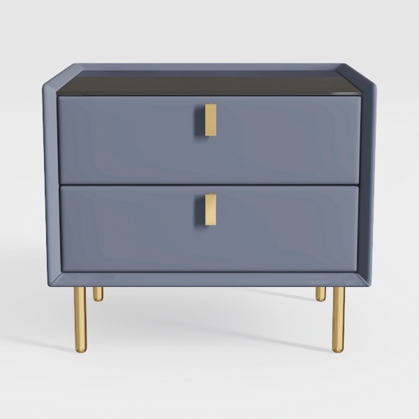 Blending geometric precision with organic softness, this bedside piece draws inspiration from mid-century modern design reimagined for contemporary bedrooms. The cabinet features a muted blue-gray matte finish, its smooth surface catching light subtly to reveal a warm undertone. Two rectangular brushed brass pulls, with a slight beveled edge, add opulent contrast, while the slim, tapering gold legs—angled outward—provide stability and a visual lift.