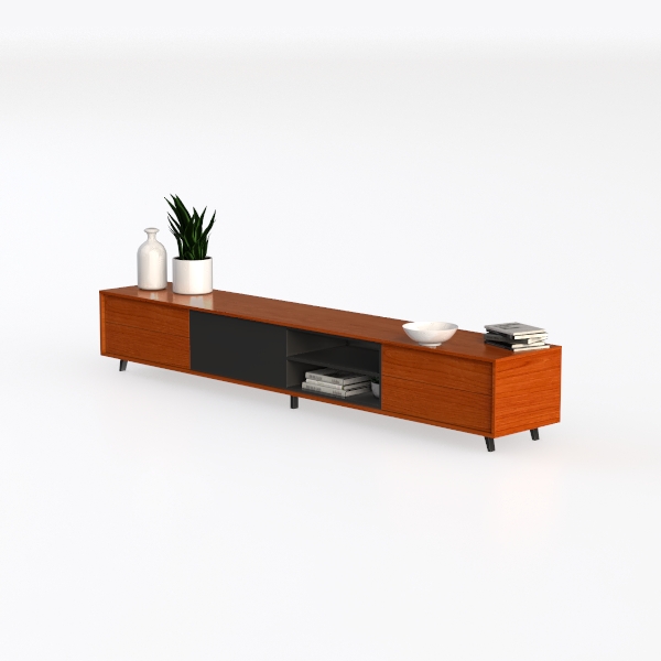 This furniture piece embodies a design philosophy rooted in balancing natural warmth with contemporary simplicity, inspired by the desire to create harmonious, lived-in spaces. Its main structure features a rich, warm wood grain surface—smooth to the touch yet subtly textured, capturing the organic beauty of natural materials and infusing the room with a cozy, inviting aura. A sleek, matte black panel contrasts elegantly with the wood, adding a modern edge that elevates the overall aesthetic without overwhelming its soft, approachable vibe. Lightweight metal legs, slender and geometric, provide stable support while keeping the piece feeling airy, making it a versatile fit for both compact and generously sized rooms.