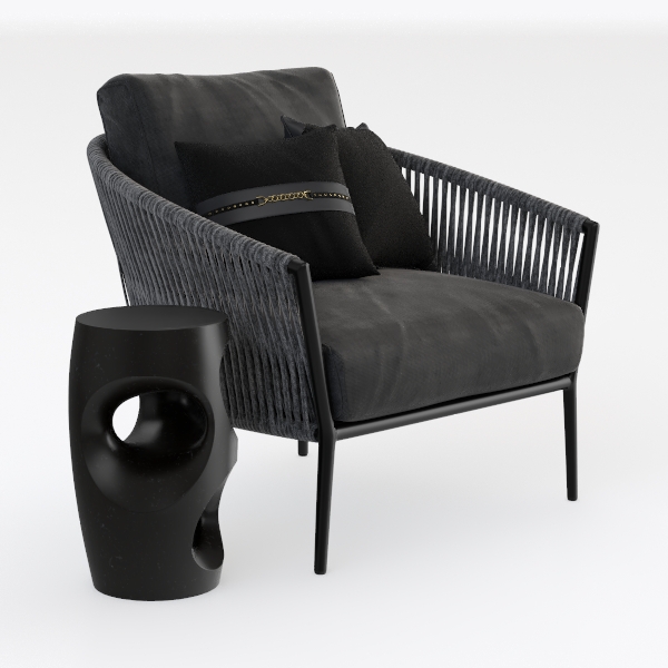 This armchair and side table set blends modern minimalism with tactile artistry, creating a focal point that balances structure and softness. Drawing inspiration from architectural geometry and natural weaving patterns, the chair’s frame features slender black metal legs that curve gently, while the gray upholstery—textured and inviting—adds warmth to the composition.