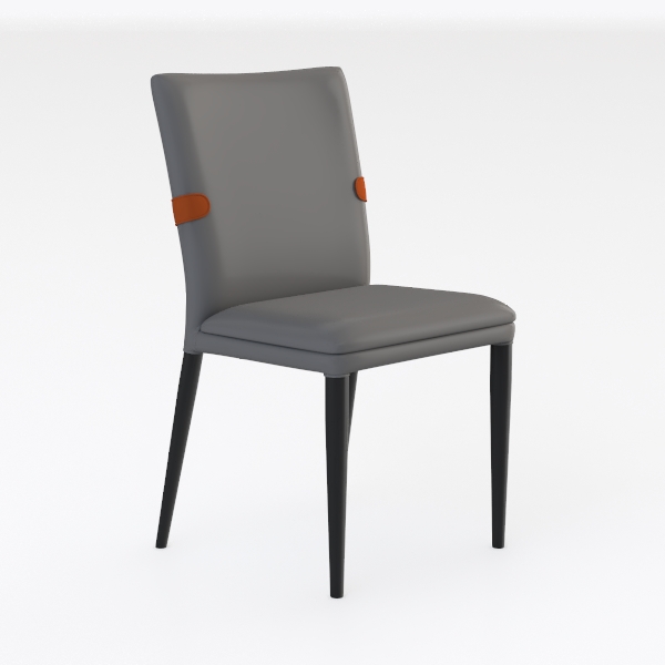 The seat and backrest feature a soft, high-quality leather upholstery in a muted gray tone, offering a smooth, cool touch that feels luxurious yet approachable. Two small, vibrant orange leather accents on the back add a playful pop of color, breaking up the neutral palette and drawing the eye to the chair’s unique character. The black, tapered legs are sleek and sturdy, their matte finish providing a grounding contrast to the polished leather, while the overall lightweight yet stable build ensures both comfort and durability.