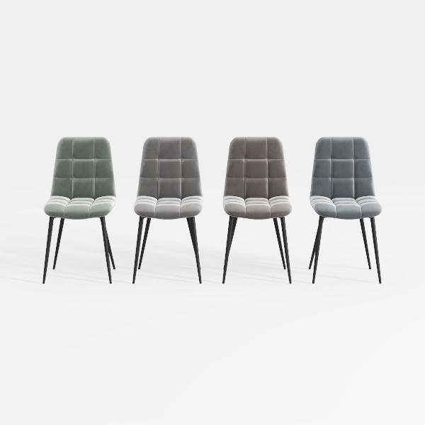 Inspired by the clean lines of Scandinavian design and the organic warmth of natural materials, these dining chairs blend simplicity with subtle sophistication. The design takes cues from geometric minimalism, with a softly textured grid pattern that runs across the backrest and seat, creating a rhythmic visual flow without sacrificing calm. The upholstery, crafted from a plush, velvety fabric, feels surprisingly lightweight to the touch—its muted sage, warm gray, and soft blue tones catching light gently to add depth, while the neutral palette ensures they complement both bold and understated decor.