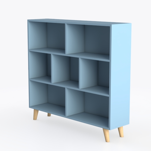 A modern blue bookshelf designed with multiple open compartments and angled wood legs, featuring 68352 polygons for stylish storage in living rooms or offices.