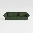 The design takes cues from the organic rhythm of nature and the adaptability of modern living, blending the softness of a mossy forest floor with the sleekness of geometric minimalism. Its rich, deep emerald upholstery shimmers subtly under light, evoking the lushness of aged leather and the supple texture of crushed velvet, while the modular block structure—with its gentle curves and interconnected sections—feels both intentional and effortless, like a carefully arranged stack of cloud-like cushions.