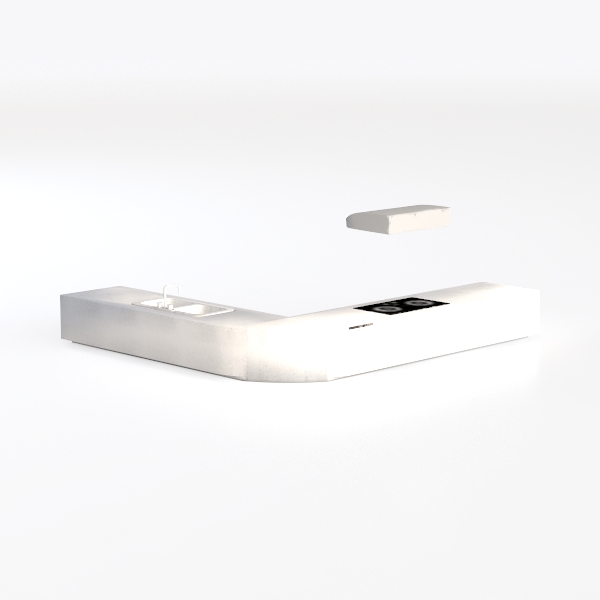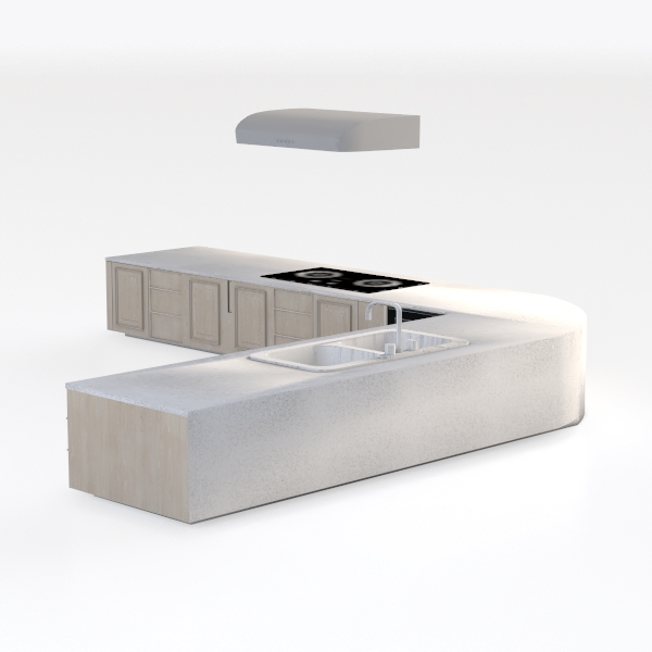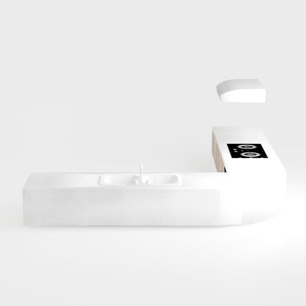 This innovative kitchen design draws inspiration from minimalist aesthetics, focusing on clean lines and functional elegance. The sleek, white countertops exude a sense of modernity while offering an inviting surface for culinary creations. The smooth texture is both visually appealing and easy to maintain, making it a practical choice for any home chef.