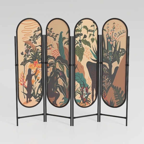 This decorative room divider draws inspiration from the lush, storytelling quality of natural landscapes and cultural artistry, blending elements of wildlife and human connection to nature. Each of its four curved panels features intricate, hand-painted illustrations: vibrant ferns, exotic birds, and silhouetted figures in warm, earthy hues—sage green, terracotta, and soft beige—creating a cohesive yet varied narrative that feels both whimsical and grounded.