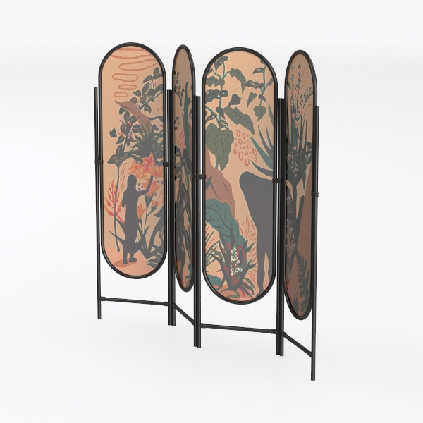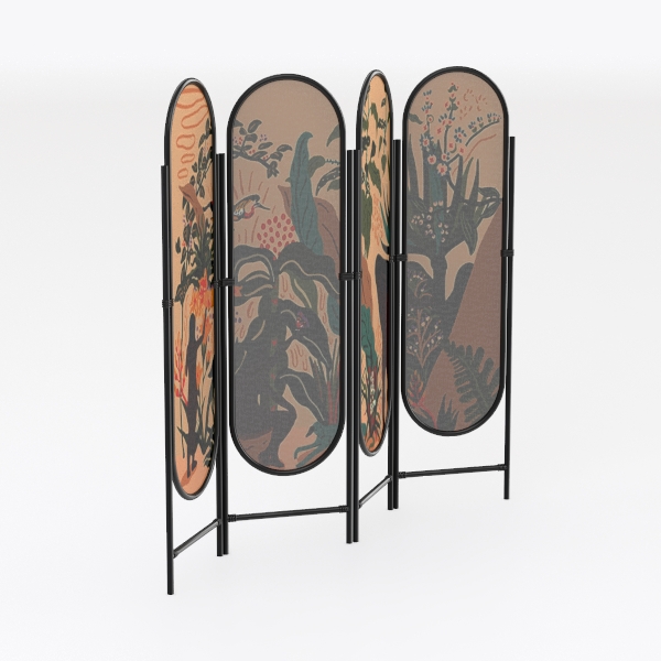 Visually, the divider balances delicate artistry with modern simplicity. The fabric surface, smooth to the touch, cradles the detailed patterns, while the slender black metal frame—sleek and minimalist—adds a cool, contemporary contrast, making the warm, organic imagery pop. Light catches the frame’s matte finish, enhancing its sculptural presence without overwhelming the softness of the panels.