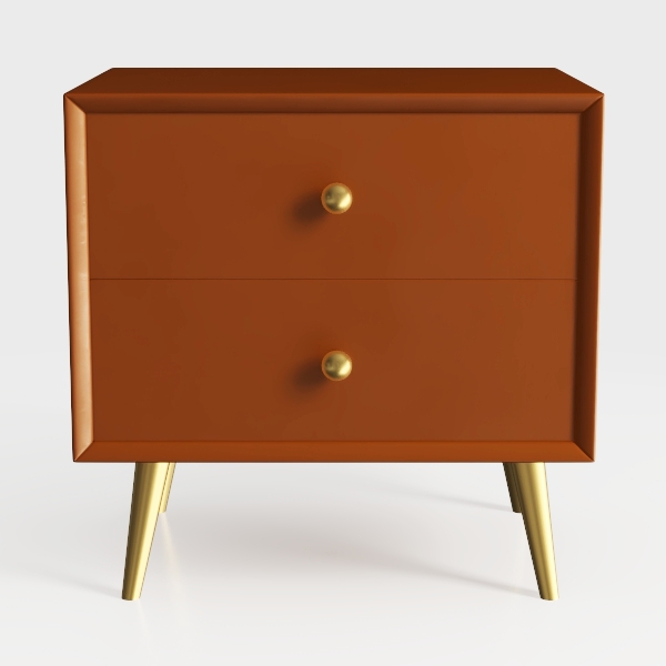 Crafted with mid-century modern aesthetics in mind, this piece draws inspiration from the warm, organic lines of 1950s furniture design, blending nostalgic charm with contemporary simplicity. The cabinet features a rich, warm brown finish, its smooth, matte surface inviting gentle touches and reflecting soft light to create a cozy, grounded feel. Two sleek, round gold pulls add a touch of opulence, their metallic sheen contrasting beautifully with the earthy tone, while the slender, tapering gold legs elevate the piece, lending it a lightweight, airy presence.