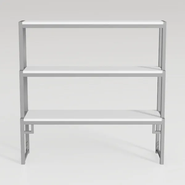 Visually, the unit presents a striking contrast: a matte-finished metal frame, with soft, silvery-gray tones that catch light subtly, exudes a cool, industrial edge, while the three smooth, pure-white shelves add a crisp, unobtrusive brightness. The shelves slope slightly inward at the edges, balancing a sense of lightness with the practicality of containing items, and the frame’s slender, geometric legs keep the piece from feeling bulky, instead enhancing its airy presence.