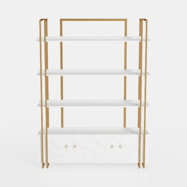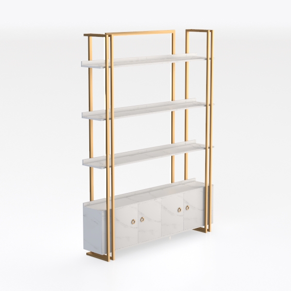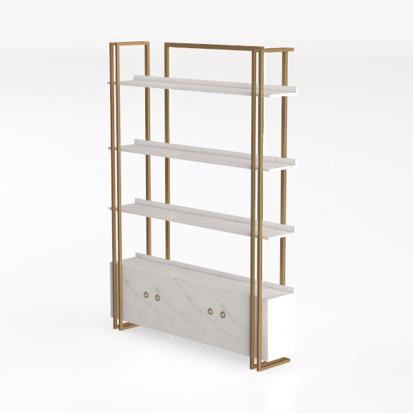 Visually, the unit feels both contemporary and grounded: the brass frame, warm and inviting, contrasts beautifully with the cool, matte finish of the marble-like shelves, creating a harmonious duality. The clean lines and balanced proportions make it a versatile piece that never feels cluttered, even when fully stocked with books, potted succulents, or decorative objects.