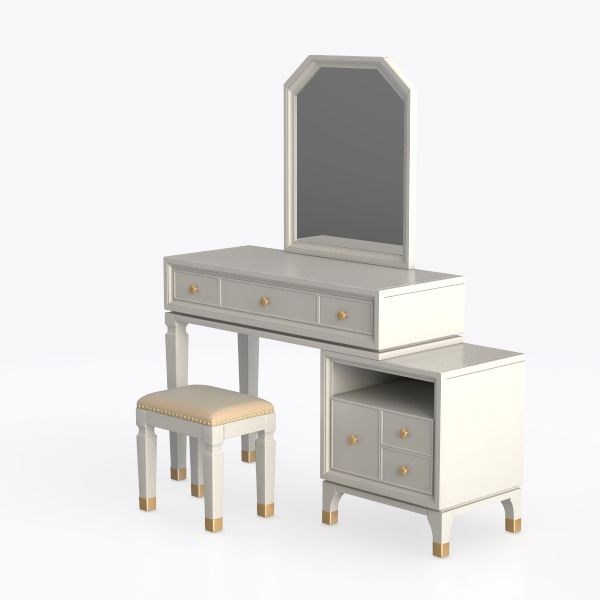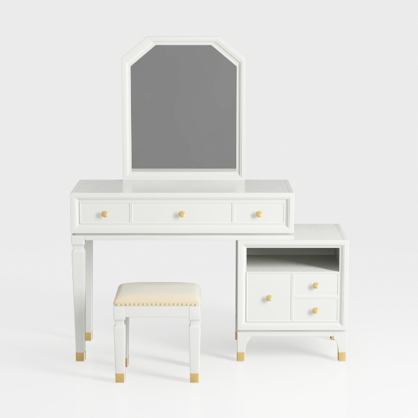 Crafted with a smooth, matte white finish, the surface exudes a fresh, airy quality, while the golden, rounded drawer knobs provide subtle contrast, elevating the overall aesthetic with understated luxury. The vanity includes three generously sized drawers for organized storage of makeup and toiletries, and an adjacent side cabinet with two smaller drawers offers additional space, ensuring clutter-free daily routines.