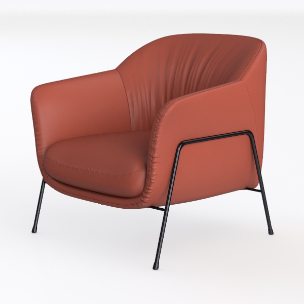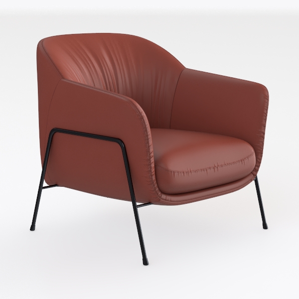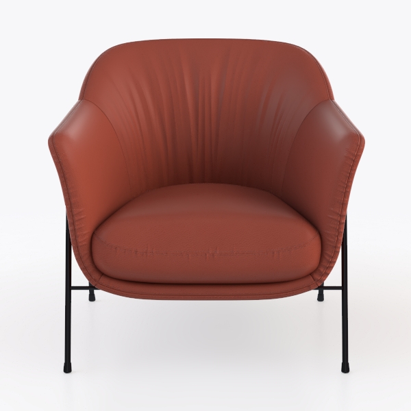 The chair features a rich, terracotta-brown upholstery with a soft, matte finish that catches light gently, revealing subtle grain details for depth. The material feels surprisingly supple to the touch—yielding slightly under pressure while maintaining firm support—making it inviting for both short rests and extended lounging. Its low-profile, rounded back and wide, plush seat cradle the body, while the black metal legs—thin yet sturdy—add a touch of industrial edge, creating a striking contrast against the warm upholstery.