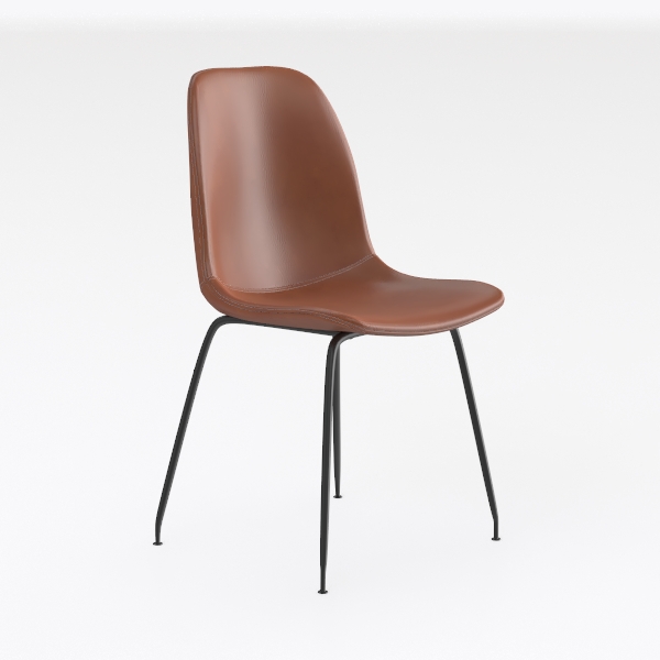 The seat and backrest showcase a warm amber leather-like material with a subtle, textured surface, catching light to reveal soft, inviting depth. Delicate white stitching traces the edge of the seat, adding a touch of intentional detail without overwhelming the design. The black metal legs, thin yet sturdy, slope slightly inward toward the base, creating a sense of lightness that contrasts beautifully with the chair’s substantial, comfortable presence.