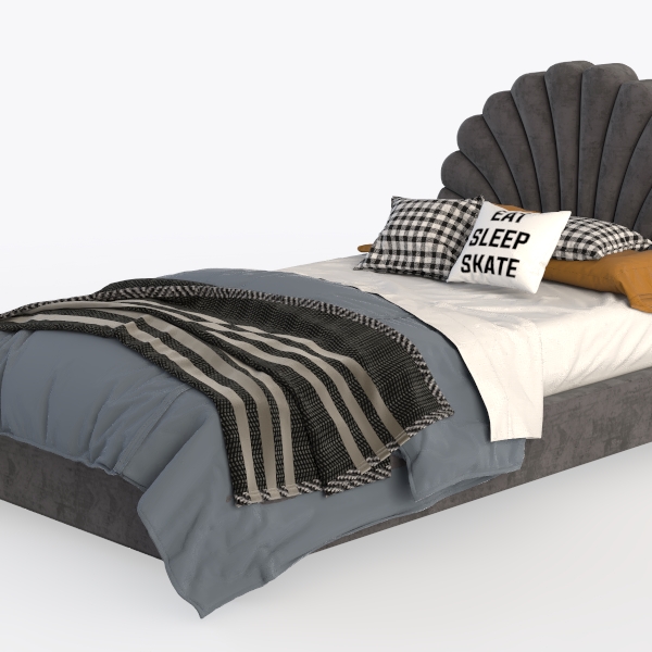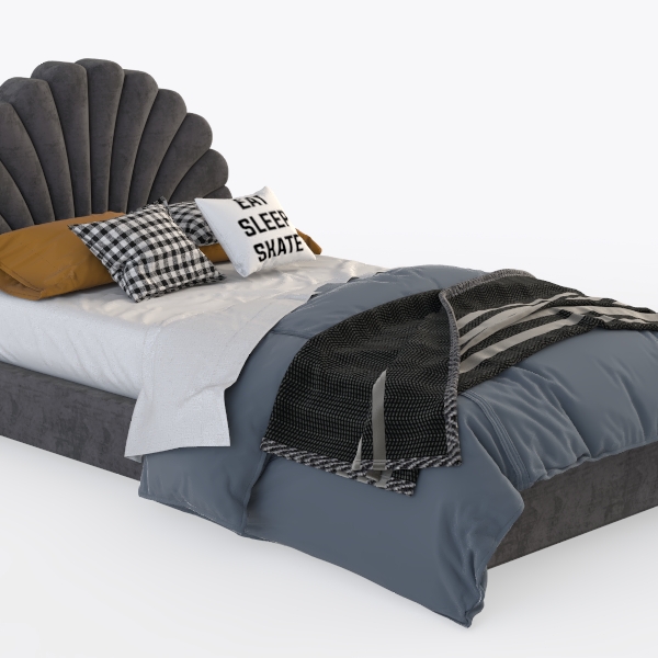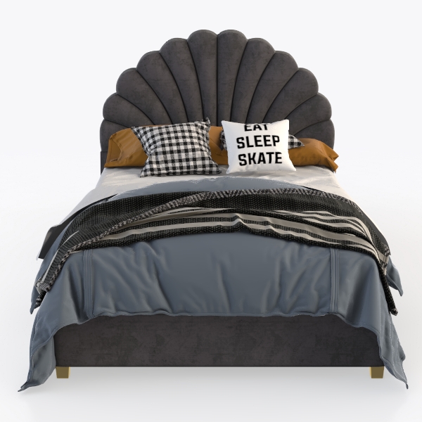 This bed stands out with a sculptural headboard inspired by the flowing curves of seashells, merging natural beauty with contemporary flair. The deep, muted gray upholstery feels luxuriously soft to the touch, its subtle texture catching light gently to create a warm, inviting glow. The headboard’s fan-like design adds depth, making it a striking focal point that balances boldness with elegance.