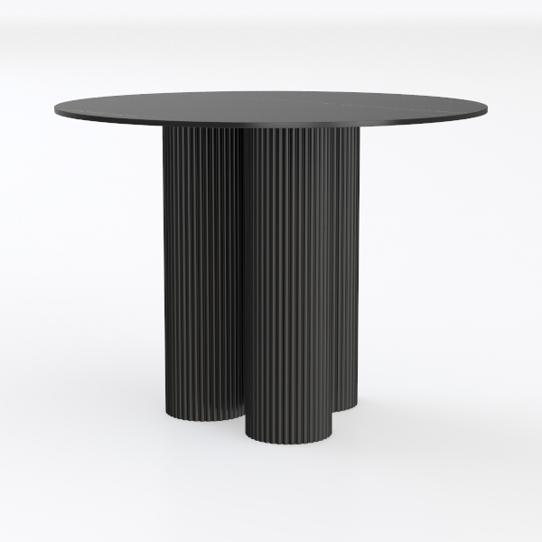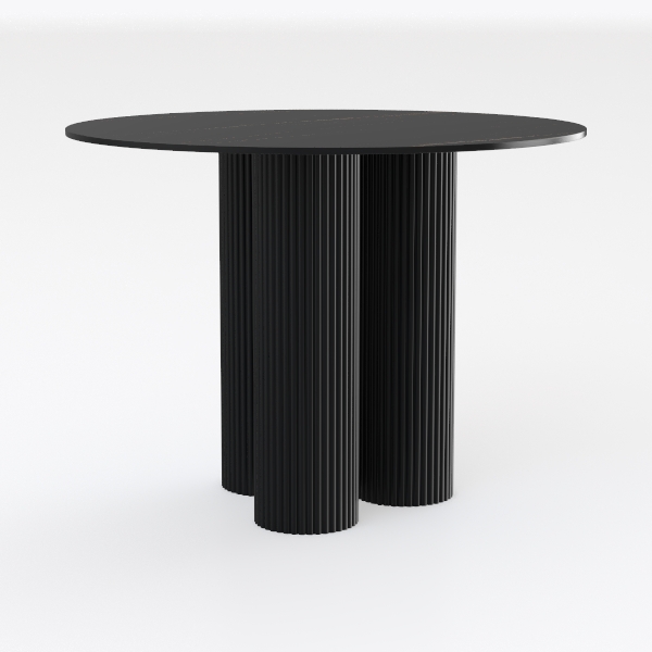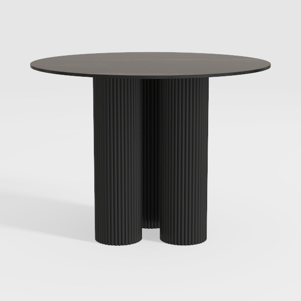 This elegant table features a smooth, dark circular top, balanced by two sleek, vertically ribbed bases that create a striking geometric silhouette. The design draws inspiration from architectural minimalism, where clean lines and structural symmetry take center stage, evoking a sense of calm sophistication. The tabletop, likely crafted from a high-quality stone or ceramic, offers a cool, matte finish that feels smooth to the touch, while the ribbed bases, in a rich black hue, add subtle texture and depth—their vertical grooves catching light softly to enhance the visual rhythm of the piece.