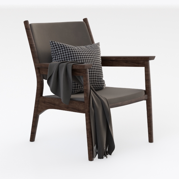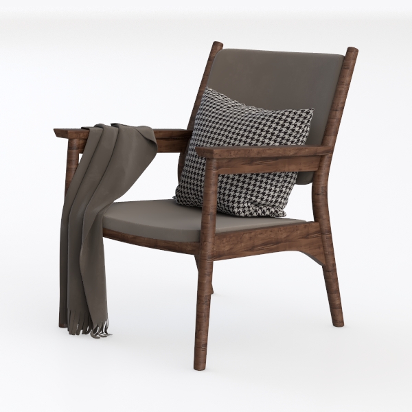 Inspired by the seamless blend of natural craftsmanship and contemporary simplicity, this chair draws from the warmth of organic materials and the clean lines of modern design. The wooden frame, with its rich, textured grain and soft honeyed hue, exudes a tactile charm, while the upholstered seat—wrapped in a muted gray, slightly plush fabric—invites comfort, its neutral tone creating a calm backdrop. A black-and-white houndstooth pillow adds a playful, classic contrast, balancing the chair’s relaxed silhouette, and a draped gray knit throw cascades over one arm, enhancing the cozy, lived-in feel.