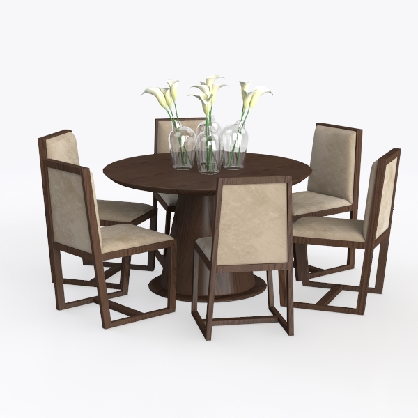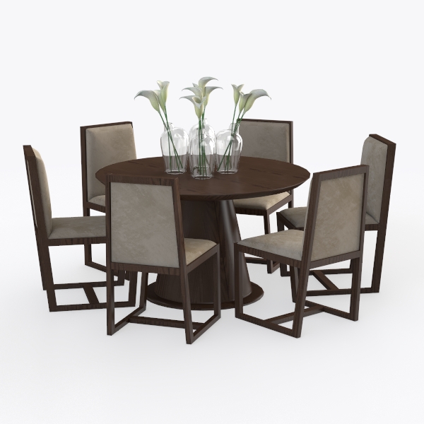The tabletop, crafted from rich, dark wood, features smooth, polished surfaces that highlight its细腻的 wood grains, catching light softly to create a warm, inviting glow. Its circular shape softens the space, while the angular, sturdy wooden legs add a grounded stability. The six accompanying chairs echo this balance: their light beige upholstery—plush yet durable—provides a gentle contrast to the table’s depth, while contoured backrests offer comfortable support.