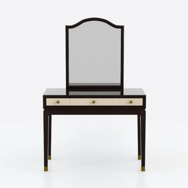 Functionality meets beauty here: the spacious tabletop provides ample room for organizing skincare products, makeup, and jewelry, while the three drawers—each with a smooth glide—offer hidden storage, keeping the space clutter-free. The slender, tapering legs, capped with small gold metal feet, add a light, airy feel, making the piece both stable and visually unobtrusive. Whether used daily for grooming or as a decorative centerpiece, it merges practicality with timeless elegance, becoming a focal point that enriches any bedroom setting.