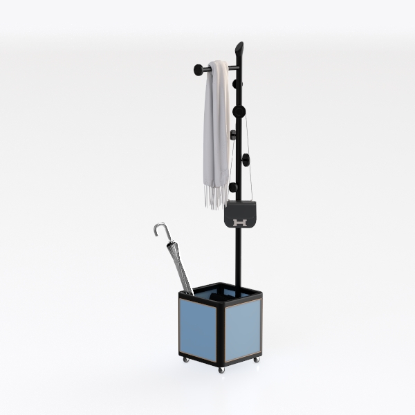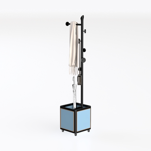 Designed to simplify daily entryways, this multi-functional furniture piece blends practical storage with modern aesthetics. Its design draws inspiration from urban living, addressing the need for a centralized spot to organize entryway essentials—from umbrellas and scarves to small bags and keys. Crafted with a matte black metal frame, the structure features a geometric silhouette: a vertical rod supports multiple hooks for hanging, while a compact, blue rectangular base at the bottom serves as a secure storage space for umbrellas and other items. The base, with its soft blue hue, contrasts gently with the dark frame, creating a balanced visual appeal that feels both contemporary and warm.