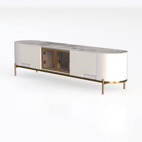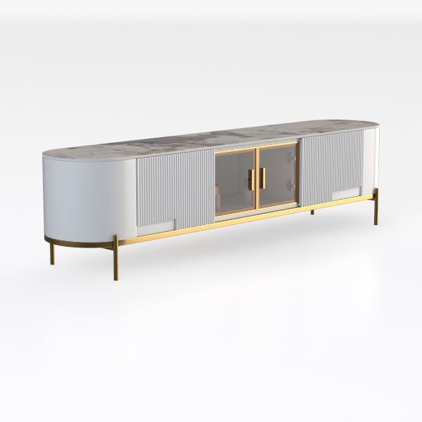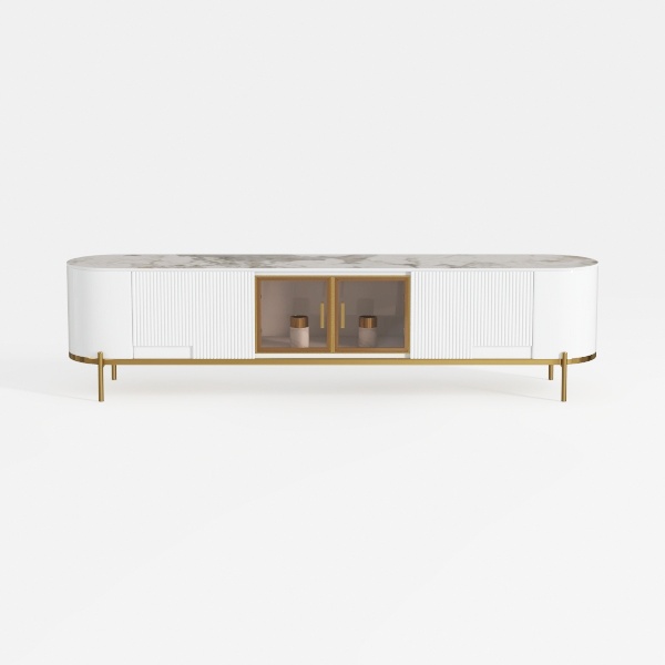 This elegant piece draws inspiration from the harmonious blend of natural stone’s organic allure and modern minimalism, with the soft veining of the top evoking timeless sophistication while the crisp white surfaces and gold accents keep it fresh and contemporary. The top, smooth to the touch, features a subtle marble-like texture that catches light gently, while vertical ribbing on the white cabinet fronts adds delicate depth without overwhelming. The slender, polished gold legs provide a floating effect, supporting the piece with grace and keeping the base uncluttered. Clear glass doors frame the middle section, revealing neatly arranged decor, while closed side panels offer hidden storage for daily essentials.