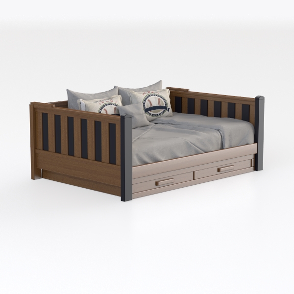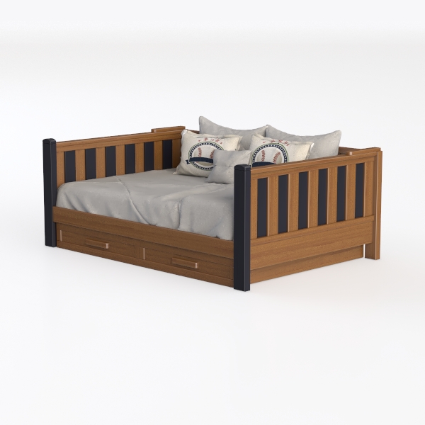 Inspired by cozy, nature-driven design, this piece blends warm wooden elements with soft textiles. The smooth oak frame and textured linen bedding create a tactile, inviting feel, with clean lines enhancing its serene look. Perfect for a kids' room, it pairs beautifully with wooden nightstands and sports-themed decor, balancing playfulness and charm. Spacious under-bed drawers offer hidden storage, while the low profile makes it ideal for lounging or resting.