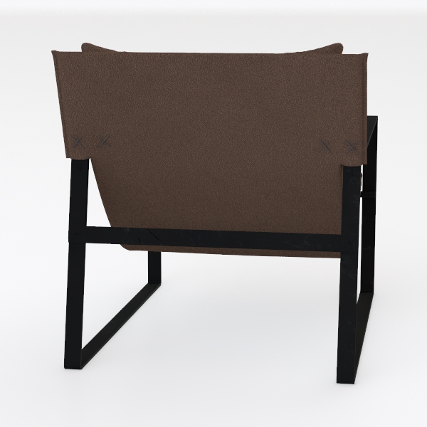 The textured bouclé fabric in warm terracotta brown wraps around the seat and backrest, inviting gentle touches with its soft, nubby surface that adds depth without clutter. Contrasting with the sleek matte black metal frame—slim yet robust, with clean, angular arms and a lightweight yet stable base—the chair strikes a harmonious balance between coziness and modern edge. From a distance, its neutral palette and uncluttered form blend seamlessly into any setting, while up close, the interplay of textures and materials creates visual interest.