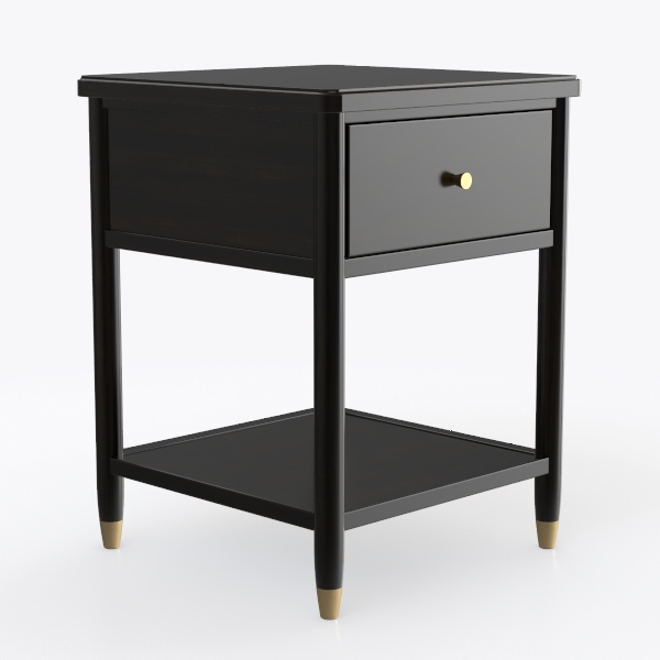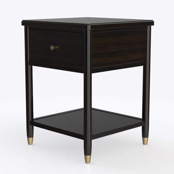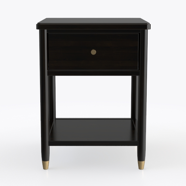 Inspired by mid-century modern minimalism, this piece blends clean lines and warm elegance. Its rich dark wood has a smooth, polished surface with a subtle sheen, cool to the touch yet warm in tone. Perfect for a modern-luxury bedroom, pair it with marble dressers and brass lighting. A spacious drawer and lower shelf offer practical storage, balancing style and function seamlessly.