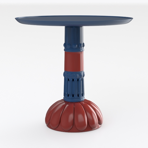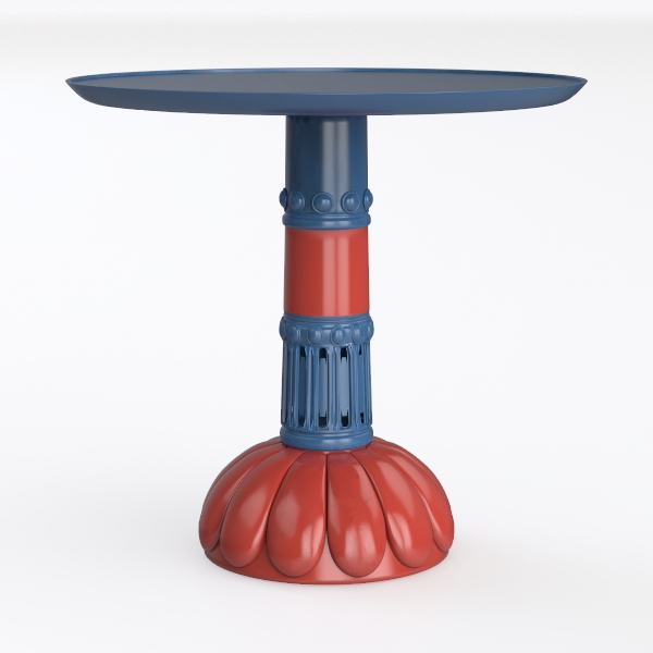 Blending architectural elegance with organic curves, its design merges classical column motifs and petal-like base, crafting a striking visual contrast. Smooth surfaces and carved column details add tactile richness, while vibrant blue and warm red hues infuse energy. Ideal for modern bohemian or mid-century spaces, it pairs with neutrals, holding drinks/decor stably—style meets function.