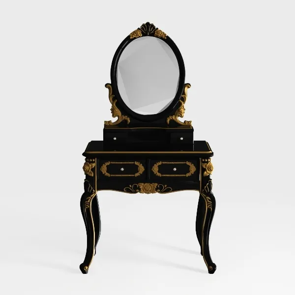 Inspired by classical European design, this vanity showcases a smooth black finish with intricate gold carvings, the oval mirror framed by ornate motifs. Its curved legs and spacious drawers with polished handles blend timeless elegance and practical storage, ideal for a vintage bedroom, enhancing the room’s regal charm with soft textiles and warm lighting.
