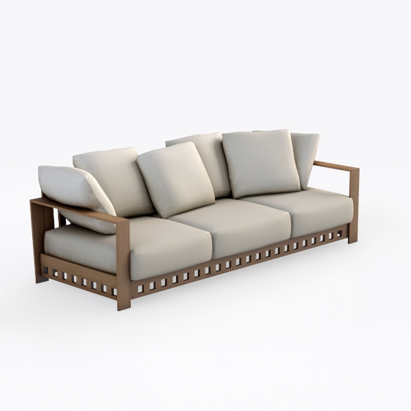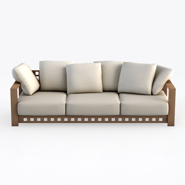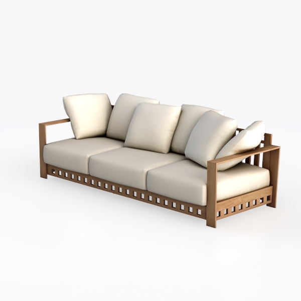 This sofa embodies a harmonious blend of minimalist design and organic warmth, drawing inspiration from the clean lines of Scandinavian craftsmanship and the tactile richness of natural materials. Its soft, light beige upholstery—crafted from a breathable, textured fabric—invites gentle contact, while the sturdy wooden frame, finished in a warm, natural tone, showcases subtle grain patterns, evoking the quiet beauty of reclaimed wood. The overall aesthetic is understated yet intentional: the three generously sized cushions, paired with two smaller, plush throw pillows, create a balanced, inviting silhouette, while the geometric cutouts along the frame add a touch of modern artistry without overwhelming the space.