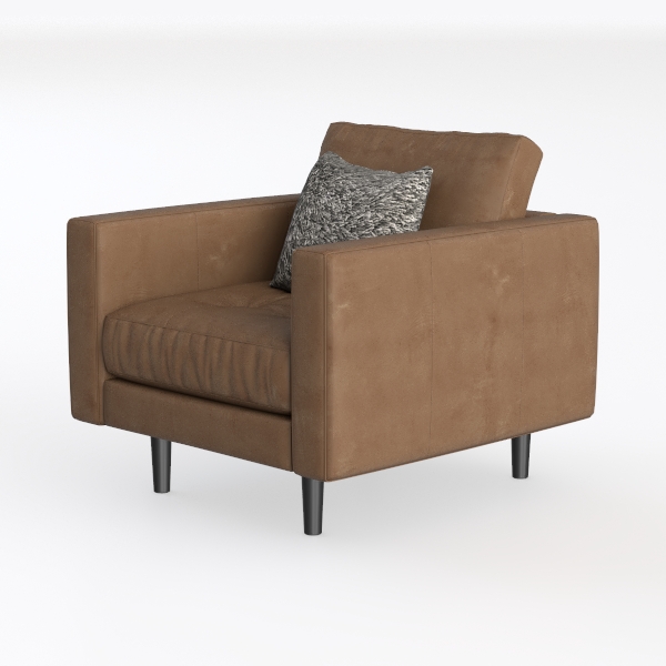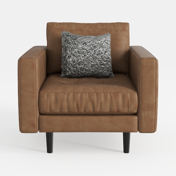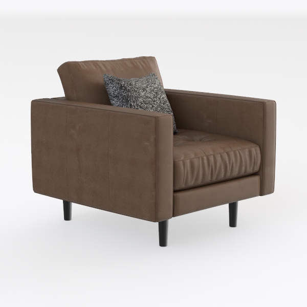 This armchair draws inspiration from the timeless allure of natural materials and the understated elegance of mid-century modern design, blending warmth with minimalist precision. Its main body features a rich, warm brown upholstery—soft to the touch yet subtly textured, catching light with a gentle sheen that evokes the depth of well-crafted leather. The seat cushions, slightly padded and tufted along the edges, offer a plush, cloud-like feel, while the low, wide profile invites relaxation, as if designed to cradle the body in comfort. The armrests curve gently, balancing sturdiness with approachability, and the black, tapered legs ground the piece with a sleek, contemporary edge, ensuring it feels both substantial and lightweight.