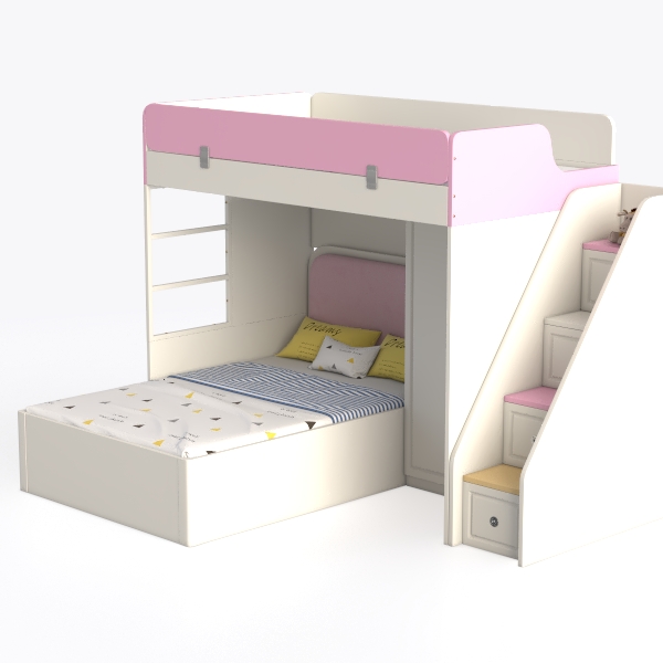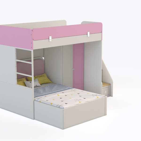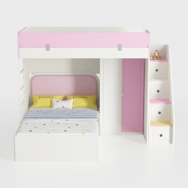Inspired by playful childhood dreams, this bunk bed blends soft aesthetics with practicality. A plush pink upholstered headboard offers gentle touch, smooth white frames and crisp lines create a clean, warm vibe. Ideal for a kids' room, it pairs well with modern or Scandinavian decor—marble accents or wooden nightstands enhance its charm. Spacious under-bed storage and staircase drawers add functionality, balancing cuteness with space efficiency.