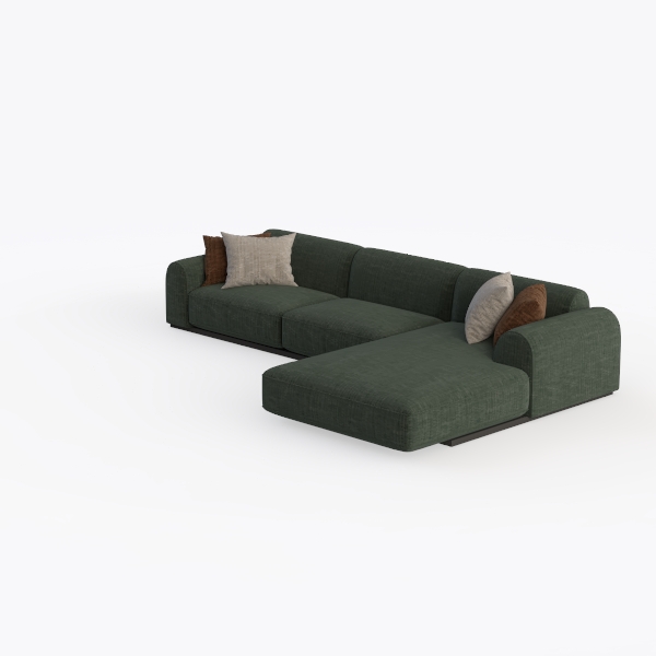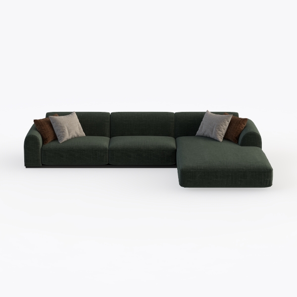 The sofa’s textured, soft-touch fabric in a rich emerald green catches the eye with its subtle sheen, while the tactile experience is equally inviting: smooth yet substantial, like resting on a well-loved, high-quality blanket. Its matte finish avoids harsh glare, instead reflecting light gently to create a warm, ambient glow that feels both luxurious and approachable. The L-shape, with its rounded armrests and generously sized, plush cushions, forms a visually cohesive silhouette that wraps around the room, enhancing any space with a sense of comfort and completeness.