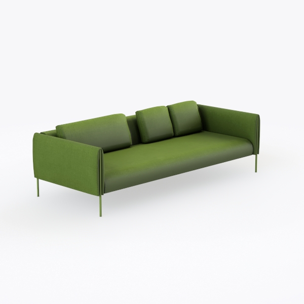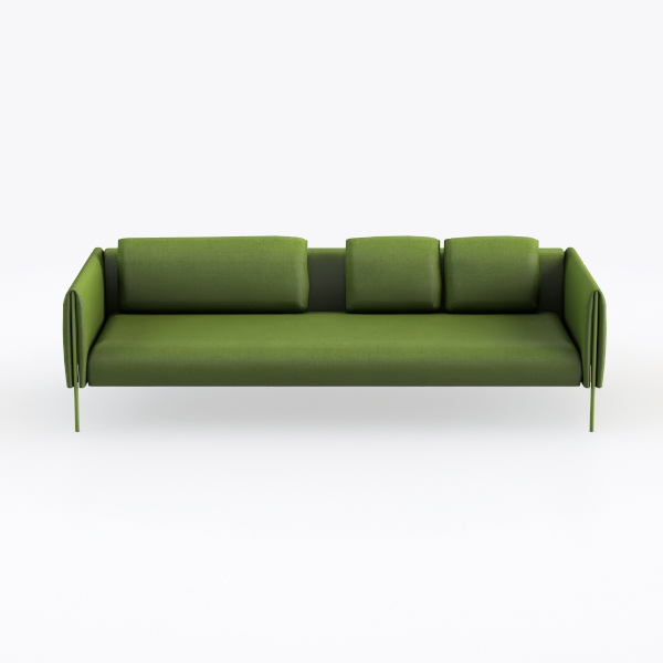 This sofa marries natural inspiration with minimalist elegance, drawing design cues from the soft, muted hues of a sunlit forest and the clean precision of geometric forms. Its lush green upholstery, with a subtle, tactile texture, feels surprisingly lightweight against the skin, while the slender metallic legs—sleek and unobtrusive—add an airy, contemporary lift, balancing the piece’s grounded presence.