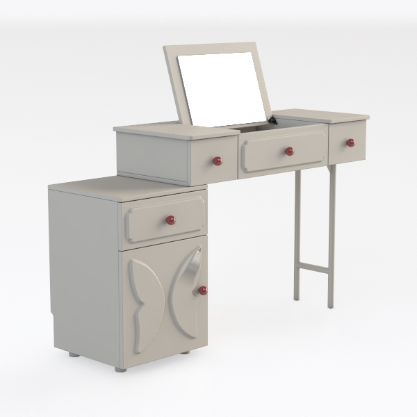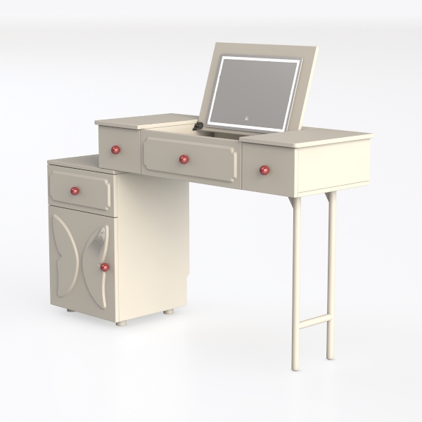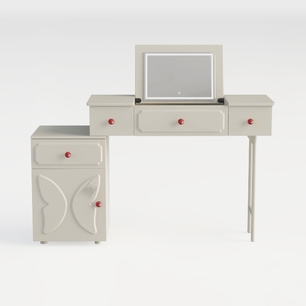 Inspired by delicate butterfly wings, this vanity blends soft off-white tones with vibrant red knobs. Smooth, polished surfaces feel comfortable; rectangular mirror aids makeup. Ideal for a cozy girl's room, pair with warm lights and plush rug. Spacious drawers and side cabinet offer ample storage, balancing charm and function.
