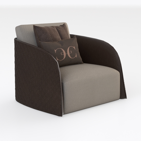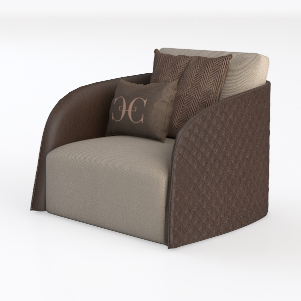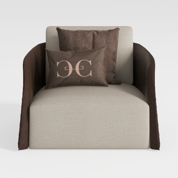 Visually, the chair’s clean, rounded lines and understated silhouette create a calm, inviting presence, its neutral palette making it a versatile anchor for any space. The two complementary throw pillows—one featuring a sleek, monogrammed “CC” in soft rose gold and the other with a zigzag herringbone pattern in the same deep brown—introduce subtle visual interest without overwhelming the piece, enhancing its sophisticated yet approachable vibe.