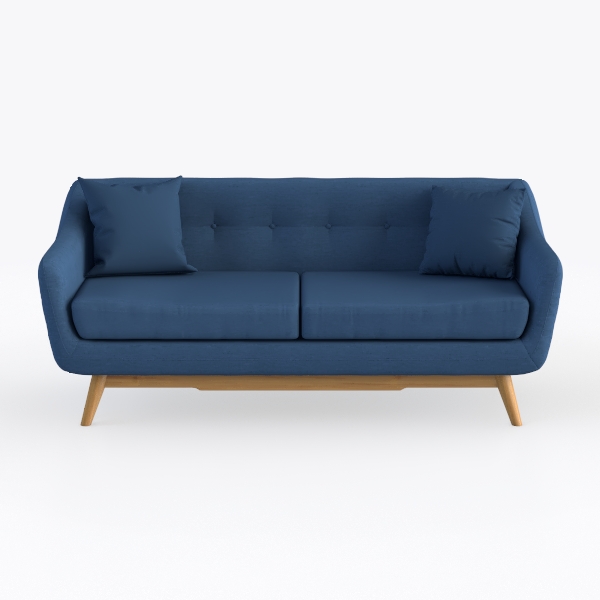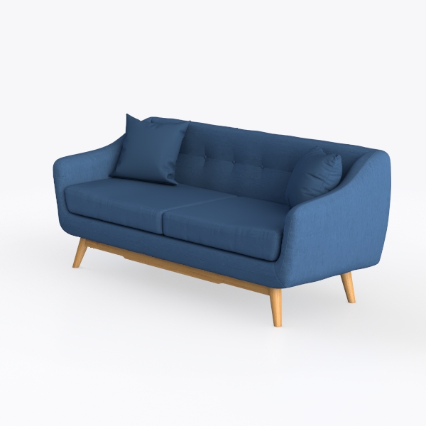 The sofa radiates a timeless blend of Scandinavian minimalism and mid-century warmth, inspired by the clean lines and functional elegance of classic Nordic design. Its deep, ocean-blue upholstery feels surprisingly soft to the touch, with a fine, breathable fabric that catches light gently, creating a subtle, inviting sheen. The two plump, matching throw pillows nestle perfectly against the sofa’s gently curved back, adding a touch of intentionality to the relaxed silhouette.