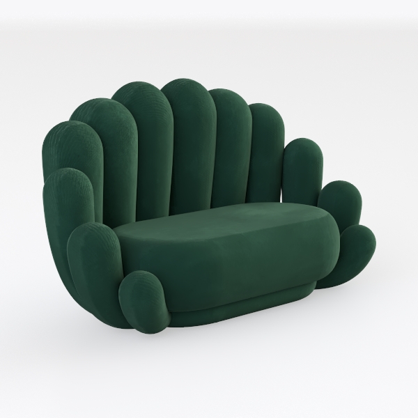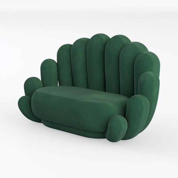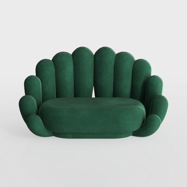 Crafted with a sumptuously soft, deep emerald upholstery, its surface feels as inviting as it appears—velvety to the touch with subtle sheen that catches light softly, while the petal-like contours create a sense of fluid movement, making it feel both substantial and light.