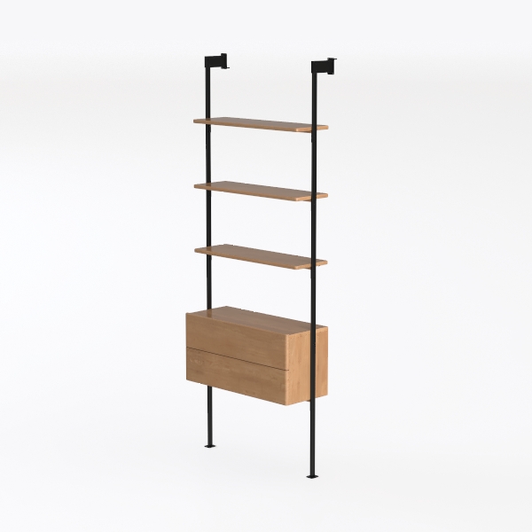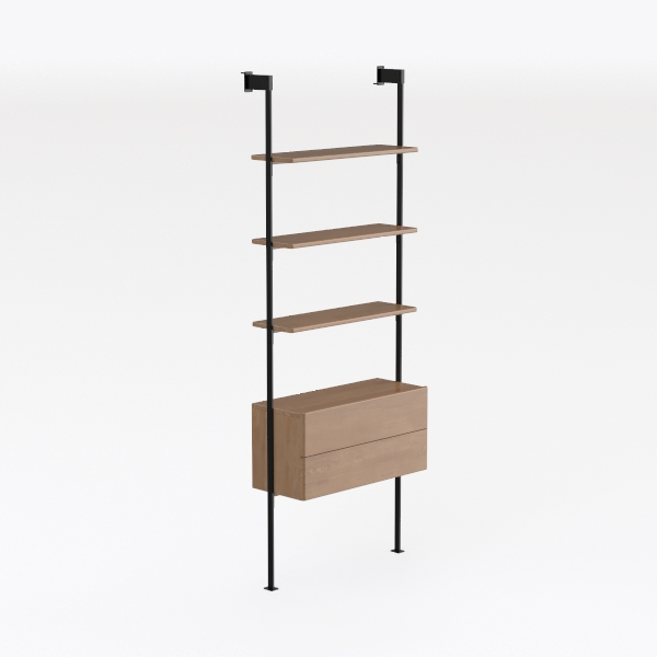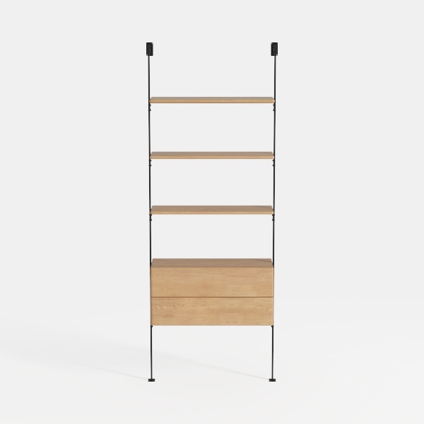 Inspired by Scandinavian minimalism, this shelving unit blends warm natural wood grains, smooth to the touch, with sleek black metal frames that add subtle industrial edge, creating a clean, uncluttered look. Ideal for modern living rooms or studies, it pairs beautifully with soft textiles and potted plants, while spacious drawers offer hidden storage, and tiered shelves provide ample display space for books and decor.
