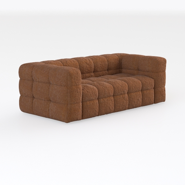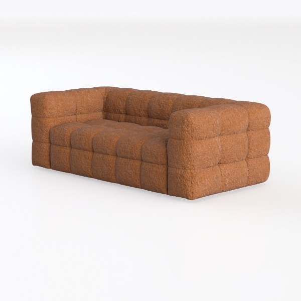 Visually, the rich terracotta-brown upholstery catches the light, with a plush, bouclé texture that feels surprisingly substantial to the touch—soft yet supportive, like sinking into a well-loved vintage blanket. The repeating grid of square cushions creates a rhythmic, almost sculptural pattern, adding depth and dimension to the space without overwhelming it, while the warm, earthy hue infuses the room with a cozy, grounded energy, as if wrapped in sunlight.