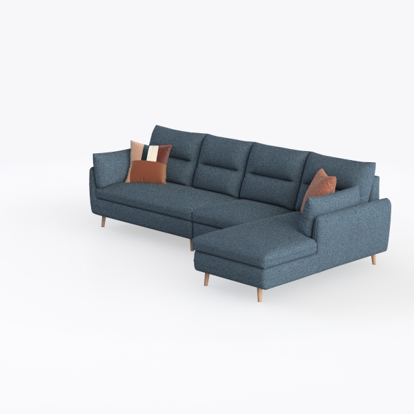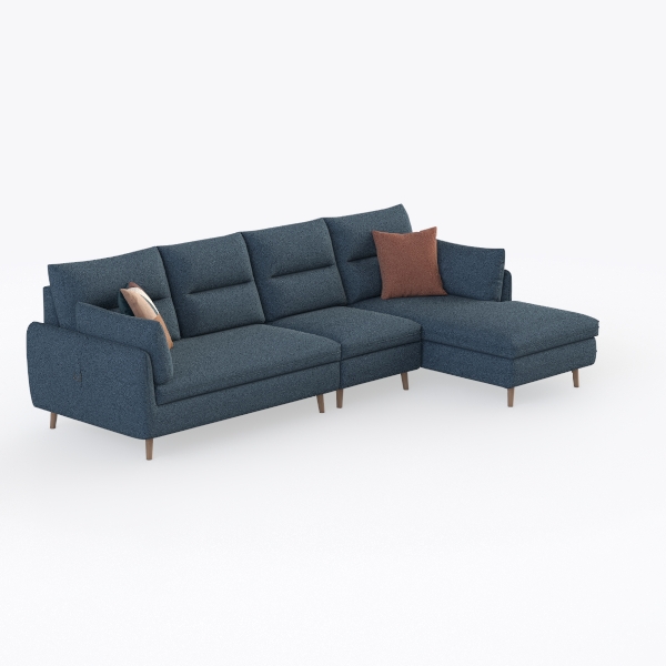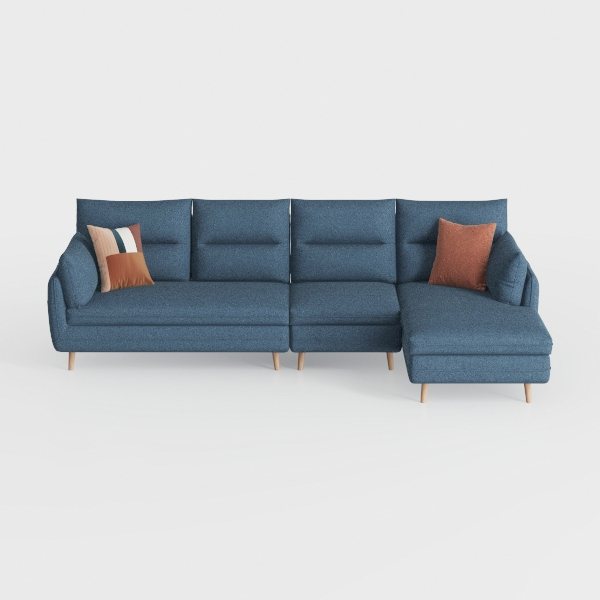 Rooted in the harmony of natural serenity and minimalist design, this L-shaped sofa takes cues from the quiet allure of a twilight ocean, where deep blues evoke calm, while subtle warmth infuses the space. Crafted with a soft, textured fabric in a rich indigo hue, its surface feels surprisingly inviting—each thread catching light to create a gentle, luminous sheen. Plush, well-padded cushions balance firm support with a cloud-like softness, ensuring comfort even during extended lounging, while low-profile arms and tapered oak legs add a light, airy quality, keeping the piece from feeling bulky.