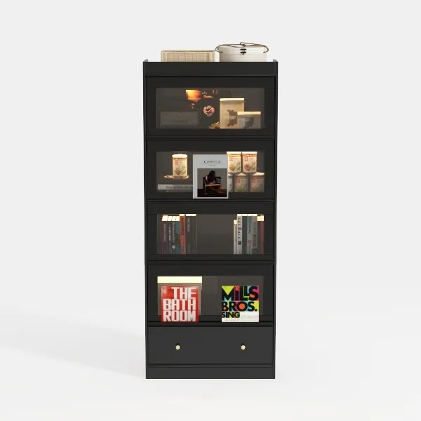 Inspired by mid-century modern design, this functional bookshelf blends clean lines with warm tactile elements. Crafted with smooth matte surfaces and subtle texture, the dark gray frame contrasts gently with wood accents and crisp book spines. Ideal for minimalist living rooms or home offices, pairing beautifully with neutral sofas and natural light. Spacious open shelves and closed cabinets offer ample storage for books, records, and decor, while integrated drawers add hidden space for small items.