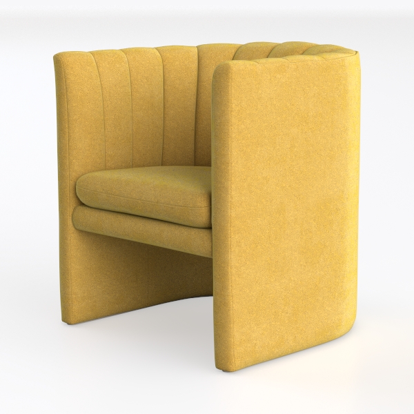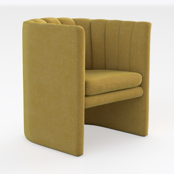 Crafted with inspiration from the flowing lines of natural forms and mid-century modern design principles, this armchair embodies a harmonious blend of soft aesthetics and functional comfort. Its warm, mustard-yellow upholstery—with a plush, velvety texture—greets the touch with gentle softness, while the backrest, shaped into elegant, fan-like folds, creates a dynamic, sculptural silhouette that feels both organic and intentional.