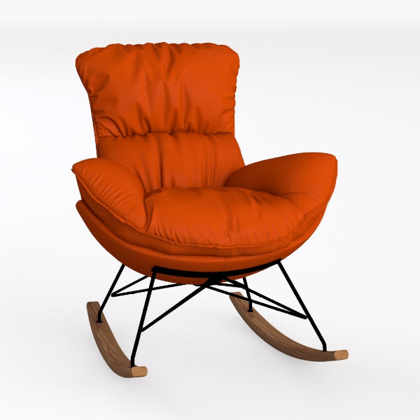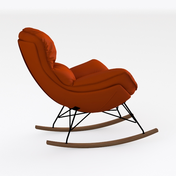 Inspired by mid-century ergonomic design, this rocking chair features soft, supple orange upholstery wrapped around a sleek black metal frame, with warm oak rocking base. Its curved, cloud-like silhouette feels plush and inviting, ideal for modern minimalist living rooms or Scandinavian spaces, paired with marble side tables and jute rugs. Generous seat depth and smooth rocking motion promise hours of cozy relaxation.
