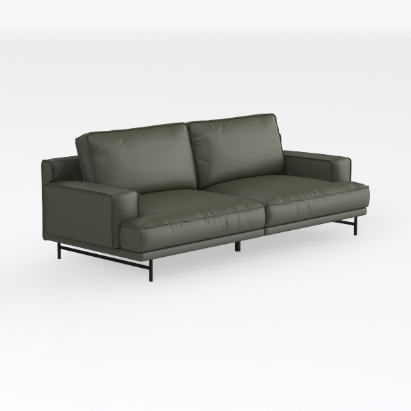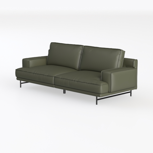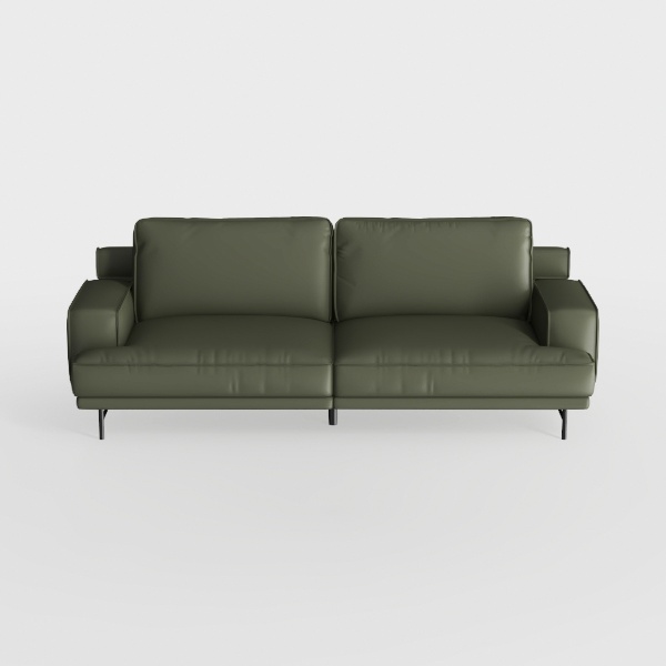 Designed to blend organic warmth with architectural precision, this sofa draws inspiration from the interplay of natural earthy tones and clean, uncluttered forms found in contemporary home design. Its rich, deep olive green upholstery—crafted from premium faux leather—boasts a smooth yet subtly textured surface, inviting a tactile experience that balances softness with subtle firmness, ensuring both comfort and durability. The visual appeal lies in its streamlined silhouette: a low-profile backrest tapers gently into angled armrests, while slim black metal legs elevate the piece, creating an airy, lightweight presence that keeps the space feeling open and unobtrusive.
