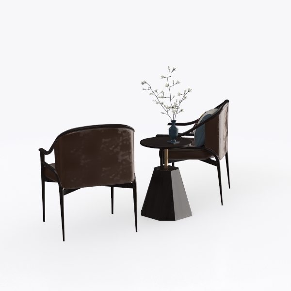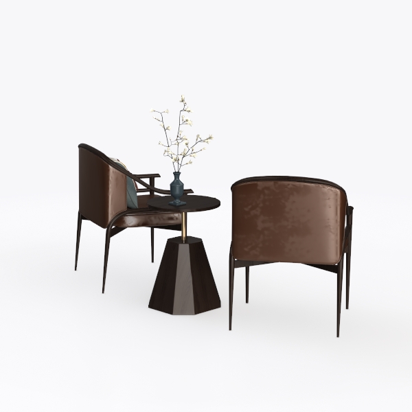 Designed by merging organic curves with geometric precision, inspired by mid-century modernism and natural minimalism, this set blends elegance and functionality. The chairs feature smooth, supple leather and soft textured fabric, while the polished wood tabletop adds warmth. Their balanced proportions and muted color palette—deep brown, blush, and navy—create an uncluttered, sophisticated look. Ideal for a modern-luxury living room or study, pairing with marble or metallic accents, with curved armrests offering comfortable support and the small table a practical spot for decor.