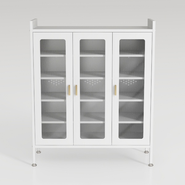 Inspired by mid-century modern design, this white cabinet blends clean lines with vintage charm. White matte surfaces contrast softly with polished brass handles, while frosted glass doors with subtle perforations add texture. Sleek metal legs elevate it, creating a light, airy look. Perfect for minimalist kitchens or home offices, pairing with wooden countertops and warm textiles. Spacious interior shelves offer storage, with transparent doors showcasing items, balancing practicality and decor.