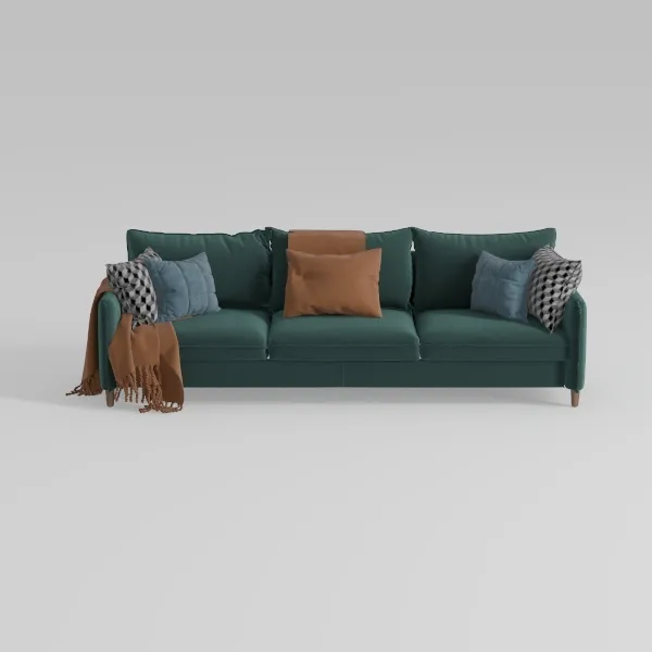 This sofa embodies a blend of modern simplicity and organic warmth, drawing inspiration from the soft, earthy tones of a sunlit woodland—its rich teal upholstery evokes the depth of moss and ferns, creating a serene focal point. The fabric feels surprisingly tactile, with a subtle, velvety texture that invites gentle caresses, while the muted hue softens the space, catching light to add delicate depth. Plump, generously sized cushions, accented with a mix of throw pillows—textural contrasts of a weathered blue linen, a warm terracotta, and a geometric black-and-white print—add visual interest without clutter, balancing structure and coziness.